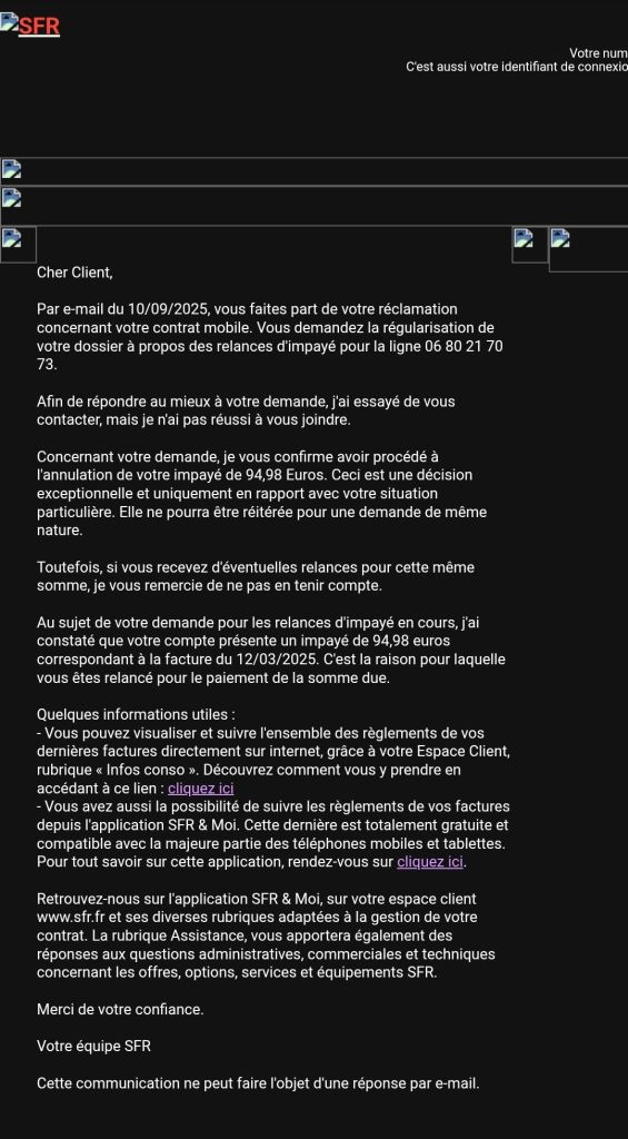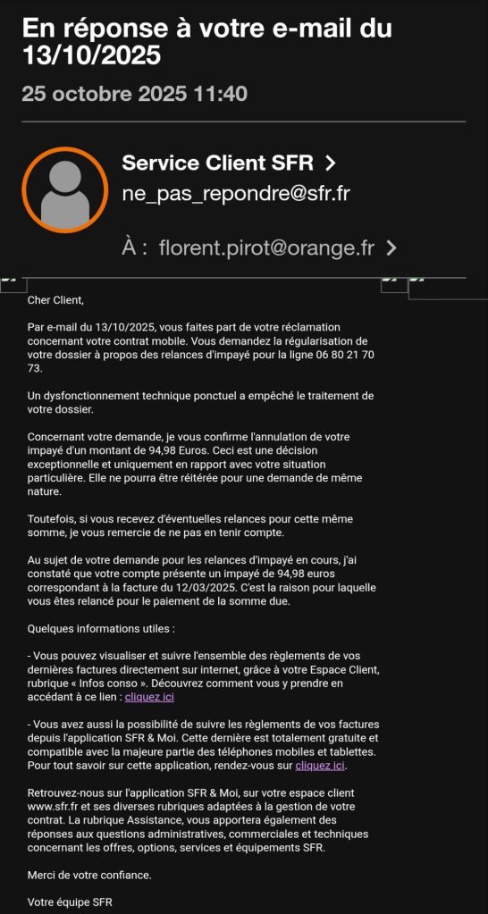 SFR m’a adressé un mail a priori incompréhensible. Celui-ci mentionne d’abord l’annulation exceptionnelle du pseudo « impayé » produit d’un scam éhonté (voir tout en bas du post), et évoque effectivement le risque de relances à négliger, puis relance immédiatement le sujet de « l’impayé ».