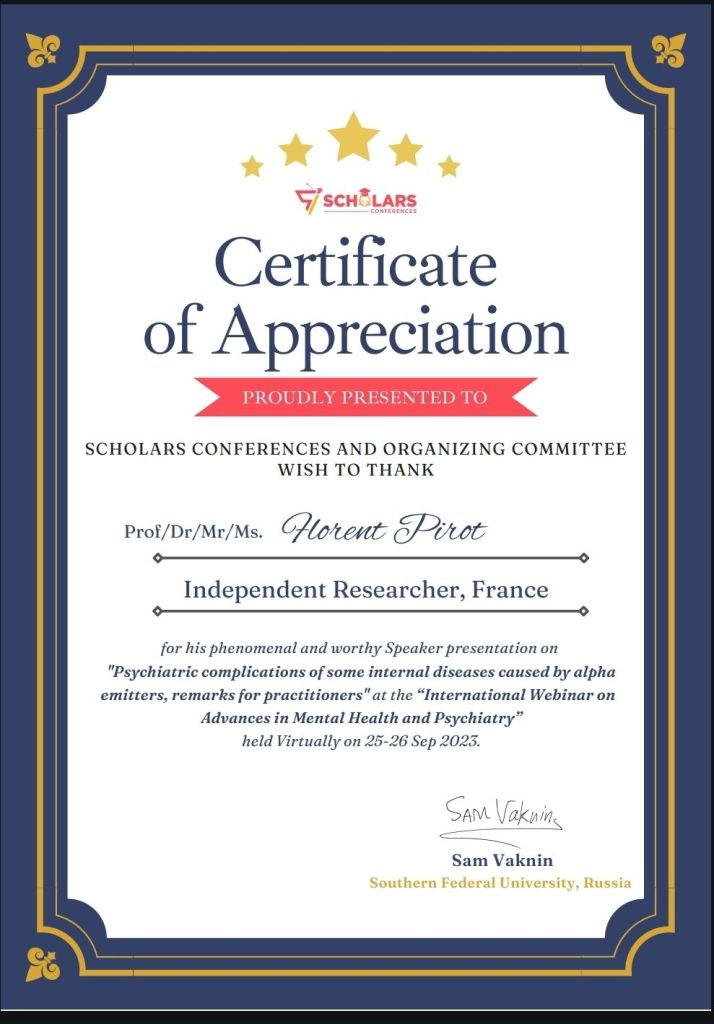 Je ne suis pas médecin mais chercheur indépendant. Je travaille souvent sur les nanoparticules émettrices alpha, sujet encore confidentiel mais responsable de nombreuses maladies. Sujet voire tabou car connecté aux armes à uranium appauvri… mes publications sont donc un peu confidentielles mais fondées sur une bibliographie approfondie et une recherche intense. L’ensemble de mes articles peer reviewés est en lien ici.